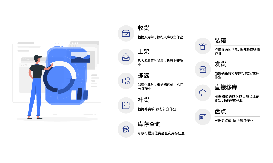 为B2B、B2C场景下多种行业提供标准化、智能化仓储作业流程管理,助力企业仓储作业全流程数字化管控